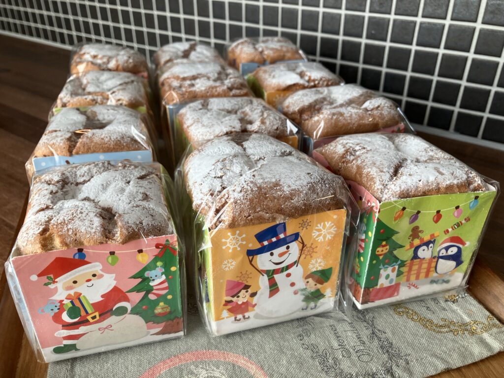 ドイツの伝統パン菓子シュトレンをイメージして、洋酒漬けのドライフルーツと胡桃をたっぷり入れ上面に有塩バターをぬり粉糖をかけました