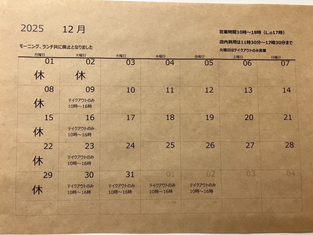 テイクアウトのみ(2日以外の火曜日と31日)10時〜16時